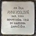 Anna Voglová was born on 1 May 1899 in Radějovice u Netonic. Her parents were Emanuel Vogl and Regina née Fuchsová. She had at least two siblings, brother Rudolf and sister Kamila. The family moved to Prague before 1910. Her sister was already born there. Anna Voglová was deported with transport AAh from Prague to Ujazdow on 10 June 1942. Her transport number was 324 of 1000. Only three Jews of this transport could survive the Shoah. Anna Voglová was amongst the 997 murdered by the Nazi regime.[11]