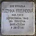 Zuzinka Freundová, also known as Zuzana, was born on 27 April 1933. She was the daughter of Walter Freund and Valerie née Stern. Together with her mother she was deported on 22 December 1942 with transport Ck to Theresienstadt concentration camp. Her transport number was 932 of 1005. On 4 October 1944 she was deported with transport En to Auschwitz concentration camp. Her transport number was 260 of 1500. The eleven-year-old girl and her mother were both murdered in Auschwitz.[16][19] |