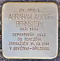 Abraham Adolf Bernstein was born on 23 March 1884. He was married to Ema Bernsteinová. The couple had at least one daughter and one son.[8] The daughter's name was Elly (born 1917). The family had to leave their house in Jihlava. They moved to Telč. On 18 May 1942, they were deported from Třebíč by transport Av to Theresienstadt concentration camp. Abraham Adolf Bernstein's transport number was 655. On 16 October 1944, he and his wife were deported by transport Er to Auschwitz concentration camp. His transport number was 168. Abraham Adolf Bernstein and his wife were murdered there on the day of their arrival in a gas chamber.[9][10][11]