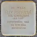 Elly Porgesová née Bernsteinová was born on 7 September 1917. Her parents were Abraham Adolf Bernstein and Ema née Morgensternová. She had at least one brother. The family had to leave their house in Jihlava. They moved to Telč. On 18 May 1942, they were deported from Třebíč by transport Av to Theresienstadt concentration camp. In Terezín, Elly Bernsteinová played a starring role in a cabaret called "Smejte se s námi" (Laugh with us). One of the authors of the play was Dr. Felix Porges. Actress and author fell in love with each other, and in 1943 there was a wedding in the camp. Both could survive the Nazi rule. After the liberation they decided to stay in the newly erected Czechoslovak Republic but they changed their name to Prokeš as they did not want to be recognized as Jews. They become parents of three sons. All three got Czech names, Zdeněk, Jan and Miroslav, and they were all baptized and registered as Catholics. Elly Porgesová died in 1975, her husband in 1982.[14]