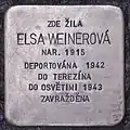 Elsa Weinerová, also Eliska, was born in 1914 or 1915 in Pacov. While on the Stolperstein 1915 is engraved, Yad Vashem and Holocaust.cz report the 16 November 1914 as day of her birth.[17] Her parents were Viktor and Marie Weiner. Her father was owner of a small leather factory, Elsa also worked here. On 16 November 1942, she, her sister Hana and her mother were deported from Tábor to Theresienstadt concentration camp by transport Cb (their number on the transport was 116). She was transferred to Auschwitz concentration camp on 6 September 1943 by transport Dl (her number on the transport was 2334), where she lived in the so-called Familienlager [family camp]. In the night of 8th to 9 March 1944 all inmates of this camp were gassed.[18][19]
