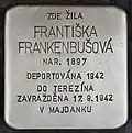 Františka Frankenbušová, also Frankenbuschová, née Herrmann was born on 22 September 1897. She was married to Rudolf Frankenbusch. The couple had two children, Zdeněk (born 1926) and Vera (born 1928). Her father died in 1924 and left his grocery to her husband. On 13 June 1942, she was deported from Kolín to Theresienstadt concentration camp by transport AAd — together with her husband and her children. Her transport number was 637. When the train arrived at the station of Bohušovice nad Ohří, she and her family were immediately taken to another train, transport AAi. Her transport number was 969. This train became later known as the Lost Train of Kolín. It was directed to the east, probably to Sobibor extermination camp, and none of the 1,000 Jews on the train survived.[23] It is known that her husband was transported to Majdanek concentration camp to do forced labour. He was murdered there on 17 September 1942. The inscription on the Stolperstein indicates, that also Františka Frankenbuschová was killed on 17 September 1942 in Majdanek. This has not been proven by the available sources till now.