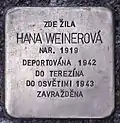 Hana Weinerová was born on 4 or 24 February 1919 in Pacov.[20] Her parents were Viktor and Marie Weiner. Her father was owner of a small leather factory, Hana also worked here. On 16 November 1942, she, her sister Elsa and her mother were deported from Tábor to Theresienstadt concentration camp by transport Cb (their number on the transport was 117). She was transferred to Auschwitz concentration camp on 6 September 1943 by transport Dl (her number on the transport was 2335), where they lived in the so-called Familienlager [family camp]. In the night of 8th to 9 March 1944 all inmates of this camp were gassed.[18][21]