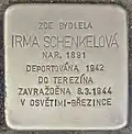 Irma Schenkelová née Roubíčková was born on 2 May 1882 in Nasavrky. She was married to Mayer Max Schenkel. The couple had a son named Zdeněk, born in 1919. Irma and Max Schenkel ran a factory that manufactured plush toys in Chotěboř. They owned a house in ul. Fominově 257. On 5 December 1942, the family was deported with transport Cf from Pardubice to Theresienstadt concentration camp. Her transport number was 187 of 650. On 5 September 1943, the family was deported with transport Dl to Auschwitz concentration camp. Her transport number was 1957 of 2484. On 8 March 1944, father, mother and son were murdered by the Nazi regime at Auschwitz-Birkenau when 3,791 former Theresienstadt inmates, all from the so-called Familienlager BIIb [family camp] in Birkenau, were gassed within one night.[2][5]