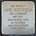 Marie Pfefferová née Lustigová was born on 4 January 1884. She was married to Eduard Pfeffer. Their last residence before deportation was in Borovice. On 16 November 1942 she and her husband were deported by transport Cb from Tábor to Theresienstadt concentration camp. Her transport number was 139 of 619. On 6 September 1943 the couple were deported by transport Dm to Auschwitz. Her transport number was 3361 of 2451 in the second train. Marie Pfefferová and her husband were murdered in the course of the Shoah.[27]