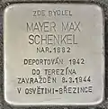 Mayer Max Schenkel was born on 20 March 1882 in Tarnów. He and his wife founded a factory that manufactured plush toys in Chotěboř. He was married to Irma née Roubíčková. The couple had a son named Zdeněk, born in 1919. He and his family lived in a house in ul. Fominově 257 in Chotěboř. After the take-over of power by the Nazis, his house became an internment home for Jews. On 5 December 1942, Max Schenkel and his family were deported with transport Cf from Pardubice to Theresienstadt concentration camp. His transport number was 186 of 650. On 6 September 1943, the family was deported with transport Dl to Auschwitz concentration camp. His transport number was 1959 of 2484. On 8 March 1944, the SS decided to clear the so-called Familienlager BIIb [family camp] in Birkenau to have space for new incoming transports from Theresienstadt.[1] During the same night, father, mother and son were gassed by the Nazi regime at Auschwitz-Birkenau, together with 3,788 other inmates.[2][3]