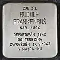Rudolf Frankenbuš, also Frankenbusch, was born on 25 March 1894. He was married to Františka Frankenbušová, the couple had two children, Zdeněk (born 1926) and Vera (born 1928). After the death of his father-in-law in 1924, he took over his grocery, which he extended and expanded into a general store. On 13 June 1942, he and his family were deported from Kolín to Theresienstadt concentration camp by the transport AAd (his number on the transport was 636). When the train arrived at the station of Bohušovice, he was immediately taken to a waiting train and transported to Majdanek concentration camp with transport AAi (his number on this transport was 921). There he had to work as a forced labourer. On 17 September 1942, Rudolf Frankenbusch was murdered in Majdanek by the Nazi regime.