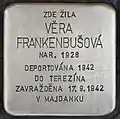 Věra Frankenbušová, also Frankenbuschová, was born on 1 January 1928. Her parents were Rudolf Frankenbuš and Františka née Herrmann. She had an older brother, Zdeněk. Her father ran a general store in Senožaty. On 13 June 1942, she and her family were deported from Kolín to Theresienstadt concentration camp by transport AAd (his number on the transport was 638). When the train arrived at the station of Bohušovice, she and her family were immediately taken to a waiting train and transported towards east with transport AAi (his number on this transport was 970). This train was later known as the Lost Train of Kolín as we still don't know where it was headed to. But it has been proven the none of the 1,000 Jews on this train did survive the Shoah. Her father was brought to Majdanek concentration camp, had to do forced labour and died there on 17 September 1942. The inscription on the Stolperstein indicates, that also Věra Frankenbušová was murdered that same day. This appears to be unsecured due to the sources.