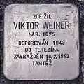 Viktor Weiner was born on 15 January 1875. He was married to Marie Weinerová née Langer. The couple had two children: Elsa (also Eliska, born 1914 or 1915) and Hana (born 1919). In Pacov he was the owner of a small leather goods factory, where wallets, bags and suitcases were manufactured. The factory burned down, and Viktor Weiner had to take out a large mortgage.[15] In 1942, his wife and children were deported to Theresienstadt concentration camp. On 5 July 1943, he was deported too to Theresienstadt (his transport number was 598), On 16 July 1943, he was murdered here.[16]