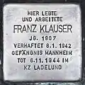HERE LIVED FRANZ KLAUSER BORN 1907 ARRESTED 8.1.1942 PENITENTIARY MANNHEIM DEAD 6.11.1944 IN LADELUND CONCENTRATION CAMP |