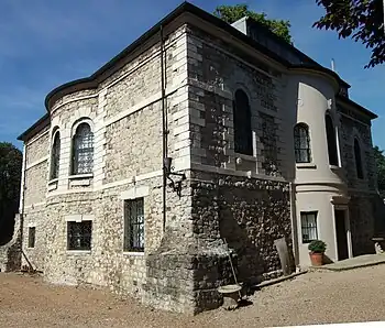 The building has such an idiosyncratic design that in the 19th century it was commonly known as the Comical House and several maps from the time labeled it as such. On three sides are full height projecting bay windows and on the fourth is a grand column portico which leads to the grounds. Originally the grounds extended on to Lewisham Way but now a wall separates the road from the grounds. The building is built from Kentish Ragstone, a limey sandstone dating from the Cretaceous period. This stone gives the building a distinctive, rustic appearance.