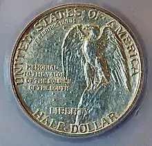 According to numismatists William D. Hyder and R.W. Colbert, "Borglum, to put it mildly, was a temperamental artist who managed to offend most everyone with whom he worked".[8] They note that "Borglum's past insolence had not left him in the good graces of the art community" and his designs met a hostile reception at the commission.[18] Sculptor member James Earle Fraser, designer of the Buffalo nickel, rejected Borglum's initial design on July 22, eight days after they were received. The inscription on the reverse included a tribute to Harding; Fraser deemed it inartistic. Borglum submitted a second set on August 14, this was again rejected; the commission criticized the design, which seemed to be only a segment of a larger one, rather than specifically designed to fit a half dollar. Borglum wanted to ignore what he deemed "damn fool suggestions", but the Association threatened to fire him if he did not complete the coin. Borglum was concerned the reverse was still too crowded, and proposed leaving off the eagle,[21] but space was saved when Coolidge did not like the reference to Harding, and it was omitted.[22] With the eagle still in place on the reverse, Fraser finally approved the designs on October 10, 1924.[23] In all, Borglum made nine plaster models for the design.[20]