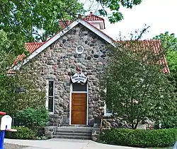 Stone School is a single-story one-room schoolhouse located on a triangular plot of land, now fenced to protect the playground. It has fieldstone walls and a cross-gabled red tile roof. Larger fieldstones form a ground-level beltcourse, corner quoins, and shallow arches above the doors and windows. The main portion of the building holds the classroom, and contains broad, square-head window on each narrow side. A front-gable entry projects forward, ad contains a wooden door with a transom above, flanked by long, narrow, double-hung, one-over-one window units. The entry is reached via wide stone steps. There is a concrete block addition in the rear.[3]