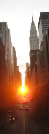 - Manhattanhenge, in New York City: due to the street grid's skew of about 28.9° and the strict grid plan on most of Manhattan island, the sunset is aligned with the street grid lines in May and July and the sunrise is so aligned in December and January.