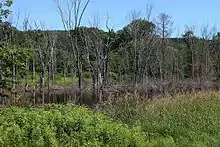 The valley of Stony Brook is forested and largely undeveloped. Although there is agricultural land upstream of the valley and on both sides of it and a housing development located on one side of the valley,[6] there is no road going through the valley, and the Columbia County Natural Heritage Inventory strongly discourages the construction of one, stating that it would "be the most destructive action against this Exceptional Value Waters stream.".[6]