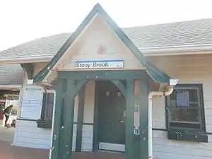 The Stony Brook station was built in 1873 by the Smithtown and Port Jefferson Railroad (although some sources have claimed it was built in 1888), and rebuilt in 1917.[4][5] Despite the impact of the arrival of Stony Brook University in 1957, the station has remained a small one-story depot. Parking has always been limited, but efforts to increase capacity at the station have been attempted both by SUNY and NYSDOT.
