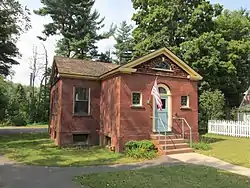 The school was built in 1856 to a simpler plan, and was originally located across the street. In 1899, Doctor Evastus Case traded with the town, giving them this parcel in exchange for the one on which it stood. At that time the building underwent major alterations, giving it its present form. It is relatively little altered since that time, and is an good example of Colonial Revival architecture.[2]