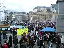 A march from the American embassy in Grosvenor Square to Trafalgar Square on 1 April 2009 brought together protesters from the Stop the War Coalition, Palestine Solidarity Campaign, The British Muslim Initiative, and the Campaign for Nuclear Disarmament.[50] On 2 April 200 people protested outside the ExCeL Centre in London where the G20 summit was being held.[51]