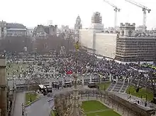 The largest demonstration organised by the Coalition was the mass protest on 15 February 2003 in London against the imminent invasion of Iraq. It is claimed to have been the largest ever such event in the UK with estimates of attendance ranging between 750,000 and 2,000,000 people.[2] The march was begun by police earlier than planned because of the number of people who had arrived at the two starting points. Speakers at the rally in Hyde Park included Tony Benn, Jesse Jackson, Charles Kennedy, Ken Livingstone, Mo Mowlam and Harold Pinter.[16][23] StWC had forecast at the end of January that about 500,000 protesters would be on the march.[24]