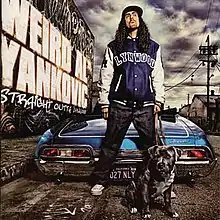 The title is a takeoff on Straight Outta Compton, an album by N.W.A. Lynwood, California, Yankovic's home town, is a neighboring community to Compton, California.[20] The cover art, inspired by "gangsta imagery",[21] depicts Yankovic, wearing a Lynwood, California, letterman's jacket and holding a pit bull on a leash, in front of a 1967 Chevrolet Impala Convertible Lowrider. All of the images from the album were photographed by Michael Blackwell on April 22, 2006. Blackwell is an Atlanta, Georgia-based photographer who has also taken images of notable hip hop stars as T.I., Lil' Scrappy, and Young Jeezy.[21][22] The cover features a pit bull named Dough Boy, owned by a local couple that was walking by during the photo shoot.[21] Yankovic had always planned for this album to be titled Straight Outta Lynwood, even when the lead single was going to be "You're Pitiful"; Yankovic had liked the ironic juxtaposition of having a gangsta rap-inspired album cover and title, with "such a toothless ballad for the lead parody".[21] However, the cover ended up being unintentionally appropriate when "White & Nerdy" became the lead track on the album. The numbers and letters on the album cover each have double meanings: "NLY" are the initials of both Yankovic's daughter and his father. The number "27" is an in-joke with Yankovic's fans, but February 7 was also his mother's birthday.[21] The license plate originally read "27 4LIFE" during the photo shoot.[23] The photo featured on the back of the CD case was Yankovic's initial pick to be the album's cover, before the current image was selected.[21]