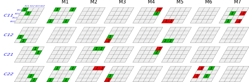 In other words, the rank of a bilinear map is the length of its shortest bilinear computation.[7] The existence of Strassen's algorithm shows that the rank of matrix multiplication is no more than seven. To see this, let us express this algorithm (alongside the standard algorithm) as such a bilinear computation. In the case of matrices, the dual spaces A* and B* consist of maps into the field F induced by a scalar double-dot product, (i.e. in this case the sum of all the entries of a Hadamard product.)