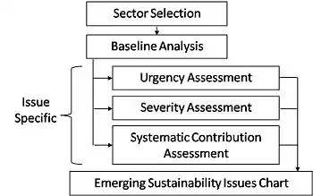 The Sectoral Emerging Sustainability Issue (ESI) chart is used to identify which aspects of a determined market sector will become a socio-environmental problem. In the common sense, an issue is called ‘emergent’ when it gets media exposure. Instead, the Tool relies on scientific Principles of sustainability[5][6] to identify what is emergent.