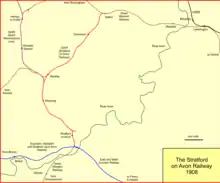In 1908 the Stratford-upon-Avon and Midland Junction Railway was formed from amalgamation of the East and West Junction Railway, the Evesham, Redditch and Stratford-upon-Avon Junction Railway and the Stratford-upon-Avon, Towcester and Midland Junction Railway.[16] The Broom Junction to Stratford-upon-Avon passenger service was withdrawn on 16 June 1947,[17] followed by the passenger service east of Stratford on 7 April 1952.[18][9]