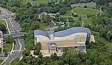The Music Center at Strathmore features an undulating roof that outlines the sloping form of the concert hall. Inspired by the rolling hills of the Strathmore grounds, the 190,000-square-foot (18,000 m2) building is nestled into an 11-acre (45,000 m2) park-like setting.