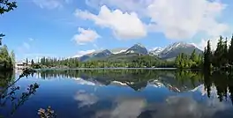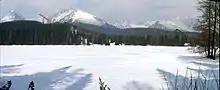 Štrbské pleso is now part of the neighborhood of Štrbské Pleso (spelled with a capital P). It is on the municipal lands of the village of Štrba, after which Štrbské pleso ("Lake Štrba") is now named. The word pleso ("tarn") is applied only to mountain lakes. The locals used to call it "the puddle" or "pond" (mláka) in the past.[1] It is the second-largest glacial lake on the Slovak side of the High Tatras, after Hincovo Pleso, to which it loses by 0.8 acres (3,200 m2).[2] It is fed by underground springs and has no visible outflow stream. Its surface remains frozen for around 155 days per year.[3]