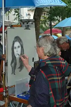 A street artist is a person who makes art in public places.[1] Street artists include portrait artists, caricaturists, graffiti artists, muralists and people making crafts. Street artists can also refer to street performers such as musicians, acrobats, jugglers, living statues, and street theatre performers. Street artists can be seen throughout the world.
