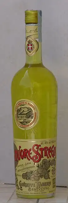 Liquore Strega is an Italian herbal liqueur produced since 1860 by the S. A. Distilleria Liquore Strega in Benevento, Italy. Its distinctive yellow color comes from the presence of saffron. Strega is bottled at 80 proof (40% ABV), which is an alcohol content comparable to most hard liquors, but it has a sweetness and viscosity typical of liqueurs. Among its approximately 70 herbal ingredients are mint and fennel, giving it a complex flavor with minty and coniferous notes.