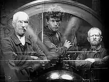 A micrometer is stolen, with a value of 25 rubles or 3 weeks pay. A worker, Yakov, is accused of the theft and subsequently hangs himself. Fighting ensues and work stops. The workers leave the milling room running and resistance is met at the foundry. The strikers throw rocks and loose metal through the foundry windows. Then locked within the gates of the complex, the crowd confronts the office. They force open the gates and seize a manager carting him off in a wheel barrow dumping them down a hill into the water. The crowd disperses.