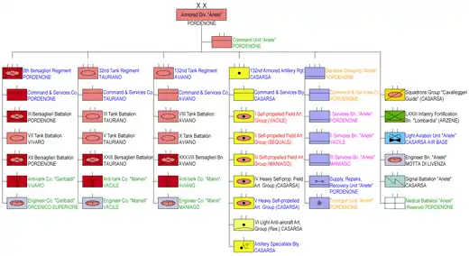 - in two because cases a division with same name existed (131st Artillery Regiment "Centauro" - Armored Division "Centauro", 132nd Artillery Regiment "Ariete" - Armored Division "Ariete")
