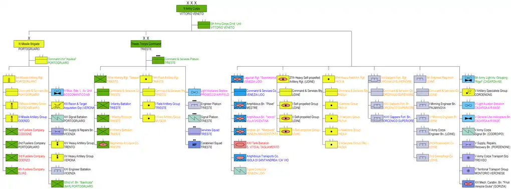 In case of war Third Army would have commanded the V Army Corps in Vittorio Veneto and the Carnia-Cadore Troops Command of the IV Alpine Army Corps. The latter command, based in San Daniele del Friuli, had been specifically created to be able to split the IV Alpine Army Corps' area of operation in case of war with Yugoslavia. Reinforcements for Third Army would have come from the III Army Corps in Milan and the VI Army Corps in Bologna.