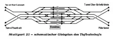- ↑ "Übersichtshöhenplan in Kilometrierungsachse Bau–km –1.5 bis Bau–km +1.5" [Overview altitude plan on kilometre axis, construction-km -1.5 to construction km +1.5 (planning status of 30 April 1999)]. Umgestaltung des Bahnknotens Stuttgart: Ausbau- und Neubaustrecke Stuttgart – Augsburg. Bereich Stuttgart–Wendlingen mit Flughafenanbindung. Planfeststellungsabschnitt 1.1 Talquerung mit Hauptbahnhof. Bau-km -0.4 -42.0 bis +0.4 +32.0 [Redesign of the Stuttgart railway node: Stuttgart–Augsburg upgraded and new line. Stuttgart–Wendlingen area with airport connection. Planning approval section 1.1: valley crossing with Hauptbahnhof. Construction-km -0.4 -42.0 to +0.4 +32.0.] (in German). DB Projekt Stuttgart 21. 24 August 2001. Annex 2.7, sheet 1 of 1.