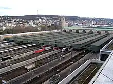 The necessary flying junctions were built according to plans by Karl Schaechterle between 1908 and 1914.[26] At the opening of the station, it had two dispatcher's signal boxes:[27] Signal box 1 provided routings for tracks 1 to 4 to and from the suburban tracks to Cannstatt and for tracks 4 to 7 to and from the suburban tracks to Feuerbach.[27] Signal box 2 provided routings for the tracks for long-distance traffic. Entry and exit of trains to the Gäu Railway and their exit to the mainline tracks to Feuerbach was possible from tracks 7 to 12. The entrance of trains from the long-distance tracks from Cannstatt was possible on tracks 8 to 13.[27] The entrance of long-distance services from Feuerbach and the exit of long-distance services to Cannstatt was possible on tracks 12 to 16.[27] In addition, there were other signal boxes for connecting to the storage yard (signal boxes 3 and 5) and the freight yard (signal box 4).[27]
