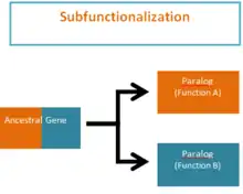 Subfunctionalization was proposed by Stoltzfus (1999)[1] and Force et al. (1999)[2] as one of the possible outcomes of functional divergence that occurs after a gene duplication event, in which pairs of genes that originate from duplication, or paralogs, take on separate functions.[3][4][5][6][7] Subfunctionalization is a neutral mutation process of constructive neutral evolution; meaning that no new adaptations are formed.[8][7] During the process of gene duplication paralogs simply undergo a division of labor by retaining different parts (subfunctions) of their original ancestral function.[9] This partitioning event occurs because of segmental gene silencing leading to the formation of paralogs that are no longer duplicates, because each gene only retains a single function.[7] It is important to note that the ancestral gene was capable of performing both functions and the descendant duplicate genes can now only perform one of the original ancestral functions.[7]