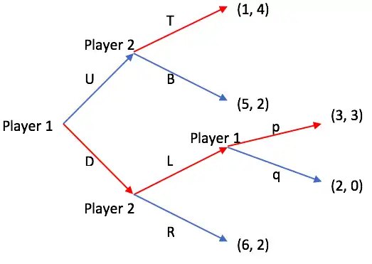 Determining the subgame perfect equilibrium by using backward induction is shown below in Figure 1. Strategies for Player 1 are given by {Up, Uq, Dp, Dq}, whereas Player 2 has the strategies among {TL, TR, BL, BR}. There are 4 subgames in this example, with 3 proper subgames.