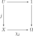 - For each monomorphism j: U → X there is a unique morphism χ j: X → Ω such that the following commutative diagram