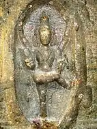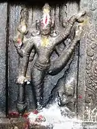 The Kambathadi Mandapam, Ardha Mandapam, and Mahamandapam, the three halls leading to the sanctum, are situated at varying elevations. The main shrine is an early rock-cut temple that has cells that house the sanctums of Murugan, Durga, Vinayaka, Shiva and Vishnu. All the statues are carved on the wall of the Parankundram rock. Shiva is worshipped as Parangirinathar with his wife Parvati as Aavudai Nayaki. Panels depicting Shiva's dance of bliss are seen outside the sanctum.[4]