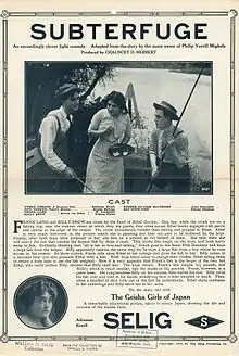 Subterfuge is a 1912 American silent film drama produced by Chauncey D. Herbert. The film stars Adrienne Kroell and Louise Reming. The film was released together with The Geisha Girls of Japan. The film status is uncertain but a release flier survives which is now at the Margaret Herrick Library at the Academy of Motion Pictures Arts and Sciences.