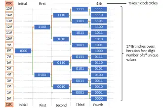 - In n-th clock cycle, if voltage is higher than digital equivalent voltage of the number in register, the (n+1)-th digit from the left is set to 1. If the voltage were lower than digital equivalent voltage, then n-th digit from left is set to zero and the next digit is set to 1. For N bit DAC, there exists N such clock cycles excluding the initial state.