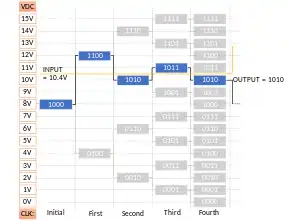The successive approximation register is initialized so that the most significant bit (MSB) is equal to a digital 1. This code is fed into the DAC, which then supplies the analog equivalent of this digital code (Vref/2) into the comparator circuit for comparison with the sampled input voltage. If this analog voltage exceeds Vin, then the comparator causes the SAR to reset this bit; otherwise, the bit is left as 1. Then the next bit is set to 1 and the same test is done, continuing this binary search until every bit in the SAR has been tested. The resulting code is the digital approximation of the sampled input voltage and is finally output by the SAR at the end of the conversion (EOC).
