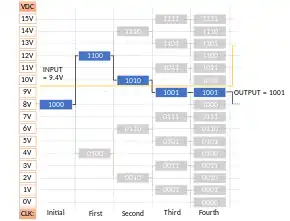 Example 2: The working of a 4-bit successive approximation ADC is illustrated below. The MSB is initially set to 1 whereas the remaining digits are set to zero. If the input voltage is lower than the value stored in the register, on the next clock cycle, the register changes its value to that illustrated in the figure by following the green line. If the input voltage is higher, then on the next clock cycle, the register changes its value to that illustrated in the figure by following the red line. The simplified structure of this type of ADC that acts on 2n volts range can be expressed as an algorithm: