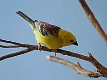 The Sudan golden sparrow is a smaller sparrow, at 12–13 cm (4.5–5 in) in length, with a wingspan of 5.7–7 cm (2.2–2.8 in). Males are distinctive in their bright yellow head and underparts, deep chestnut brown wings and back, and two white wingbars. In the breeding season the male's plumage is brighter still, and the bill changes colour from horn to shiny black. Females are pale sandy-buff with yellowish face, light brown wings, a back faintly streaked with chestnut, and pale yellow fading to whitish on the underparts. Juveniles are similar to females, but greyer.[9] About 10 weeks after hatching young males may start to get a yellow wash around the shoulder area. Its basic call is a chirp or tchirrup, similar to that of other sparrows. Variations include a song-like call, and a rapid rhythmic che-che-che.[9][10]
