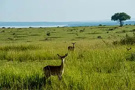 Throughout the Sudan region's savanna grasslands, kob are found migrating along freshwater bodies