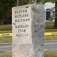 The original town center and meetinghouse were located near the Sudbury River at what is now known as Wayland's North Cemetery.[5] For the residents on the west side of the river, it was a treacherous passage in the winter and attendance at both worship services and Town Meetings was compulsory.[6][7] In 1723 the West Parish meetinghouse was built west of the river at an area known as Rocky Plains (presently the Town Center). It served as a place for both worship and Town Meetings.[8] The church and town separated in 1836 and a new Town House was built in 1846.[9] Since then, the Sudbury Center Historic District has changed little, with the exception of the Town Hall, built in 1932 to replace the Town House, which burnt down in 1930.