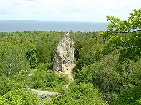 Sugar Loaf is a 75-foot-high (23m) landlocked rock or stack in the interior of Mackinac Island in Lake Huron. Created by erosion during the period of postglacial Lake Algonquin, Sugar Loaf is the largest post-glacial erosion feature in the Straits of Mackinac.