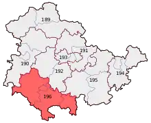 Suhl – Schmalkalden-Meiningen – Hildburghausen – Sonneberg is an electoral constituency (German: Wahlkreis) represented in the Bundestag. It elects one member via first-past-the-post voting. Under the current constituency numbering system, it is designated as constituency 196. It is located in southwestern Thuringia, comprising the city of Suhl and the districts of Hildburghausen, Schmalkalden-Meiningen, and Sonneberg.[1]