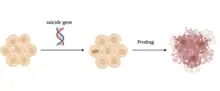 One of the challenges of cancer treatment is how to destroy malignant tumors without damaging healthy cells. A new method that shows great promise for accomplishing this employs the use of a suicide gene. A suicide gene is a gene which will cause a cell to kill itself through apoptosis. Suicide gene therapy involves delivery of a gene which codes for a cytotoxic product into tumor cells.[6] This can be achieved by two approaches, indirect gene therapy and direct gene therapy. Indirect gene therapy employs enzyme-activated prodrug, in which the enzyme converts the prodrug to a toxic substance and the gene coding for this enzyme is delivered to the tumor cells. For example, a commonly studied strategy based on transfection of herpes simplex virus thymidine kinase (HSV-TK) along with administration of ganciclovir (GSV), in which HSK-TK assists in converting GCV to a toxic compound that inhibits DNA synthesis and causes cell death.[7][6][8] Whereas, direct gene therapy employs a toxin gene or a gene which has the ability to correct mutated proapoptotic genes, which can in turn induce cell death via apoptosis.  For instance, the most researched immunotoxin for cancer therapy is the diphtheria toxin as it inhibits protein synthesis by inactivating elongation factor 2 (EF-2) which in turn inhibits protein translation,[6][9] Moreover, p53 is identified to be frequently abnormal in human tumors and studies show that restoring function of p53 can cause apoptosis of cancer cells.[6] Suicide gene therapy is not necessarily expected to eliminate the need for chemotherapy and radiation treatment for all cancerous tumors. The damage inflicted upon the tumor cells, however, makes them more susceptible to the chemo or radiation. This approach has already proven effective against prostate and bladder cancers. The application of suicide gene therapy is being expanded to several other forms of cancer as well. Cancer patients often experience depressed immune systems, so they can suffer some side effects of the use of a virus as a delivery agent.